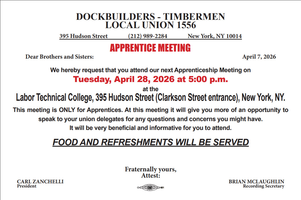 **** Our next Apprenticeship Meeting will be on Tuesday, April 28, 2026 at 5:00pm (Click Here)